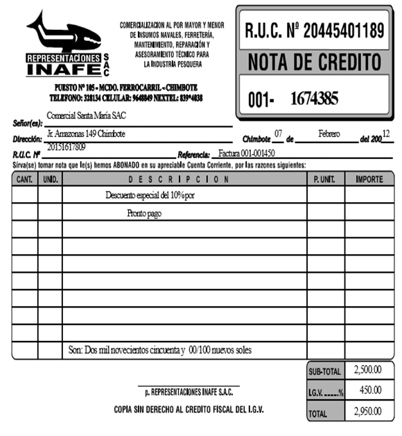 Anexo n 3 nota de crédito electrónica anexo a servicios publicos excepto en los casos de tipo de nota de credito 03. Mateo nota de credito defontana segun lo conversado la nota de credito 713 tenia que generar un ingreso al inventario para generar una nueva factura por los mismo productos. Este rubro será llenado sólo en el caso de haber indicado 2 como modalidad de devolución en la casilla 39 recuerde que no es válido para tributos de essalud y onp. En este caso se puede utilizar la figura de una nota de crédito para indicar la devolución ocasionada por el descuento.