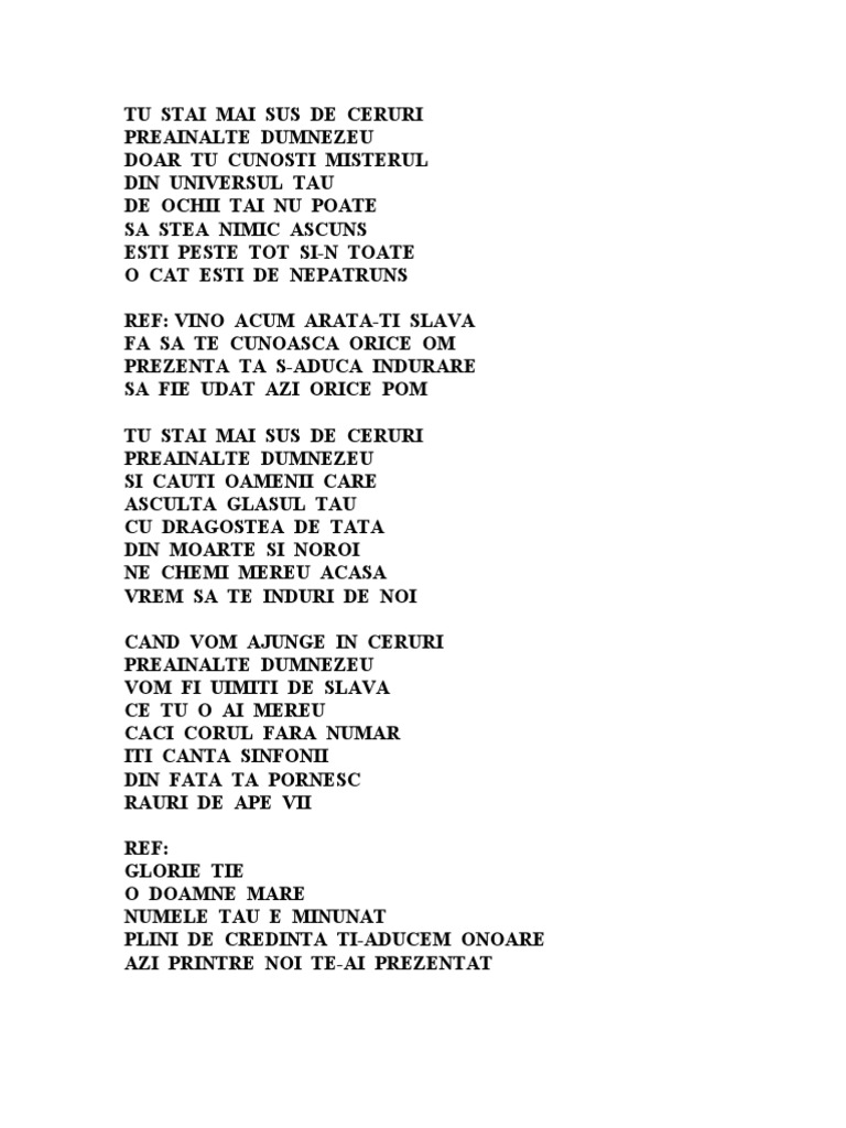 Mai sus de oameni ro en si de mparati mai sus de toate pe care le ai creat mai sus de nume mai sus de întelepti tu ai fost ramâi în veci de veci. Mai sus de tronuri și mpărății mai sus de a lumii mari minunății mai sus de aur și tot ce i valoros tu rămâi în veci cel mai prețios refren. Mai sus de oameni şi de mpăraţi mai sus de toate pe care le ai creat mai sus de lume mai sus de înţelepţi tu ai fost rămâi în veci de veci. Mai sus de tronuri si mparatii mai sus de a lumii mari minunatii mai sus de aur si tot ce i valoros tu ramai in veci cel mai pretios.