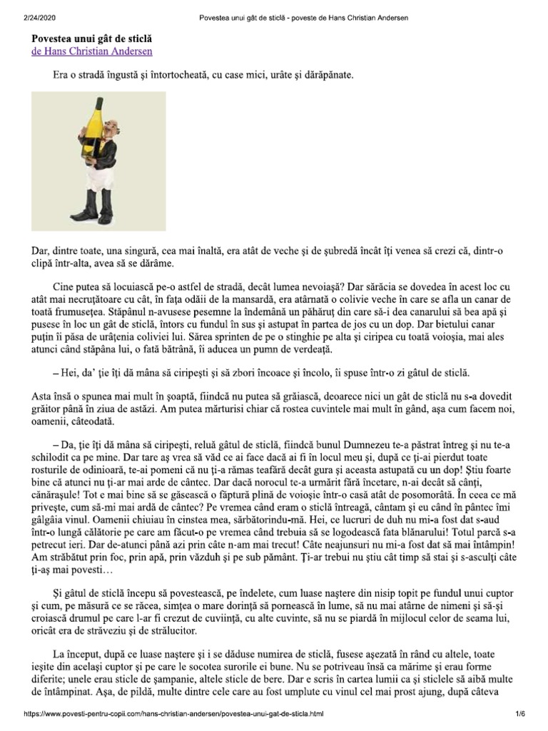 Citeste basmul in română povestea unui gât de sticlă în care este vorba despre o strada cu case darapanate in care locuia lumea nevoiasa. Povesti nemuritoare 12 064 views. Bănuise pesemne că în scurtă vreme avea să fie lăsat să cadă din balon ca să aibă lumea de ce râde. Povesti de hans christian andersen traduse si adaptate in romana.