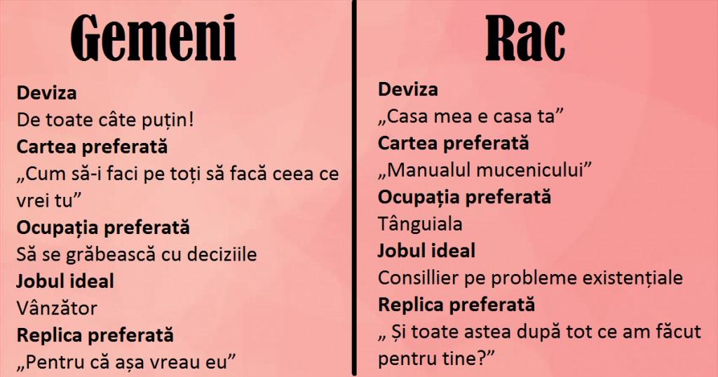 Zodia gemeni caracteristici. Sunt acele persoane care te trădează te împung pe la spate si in care nu poți să ai nici o încredere. Sunt persoane foarte adaptabile cu o minte flexibila. Femeia din zodia gemeni nu este foarte interesată de bunăstarea materială de acumularea de bunuri și de lux. Sunt renumiti pentru a detine o capacitatea uimitoare de a face fata obstacolelor.